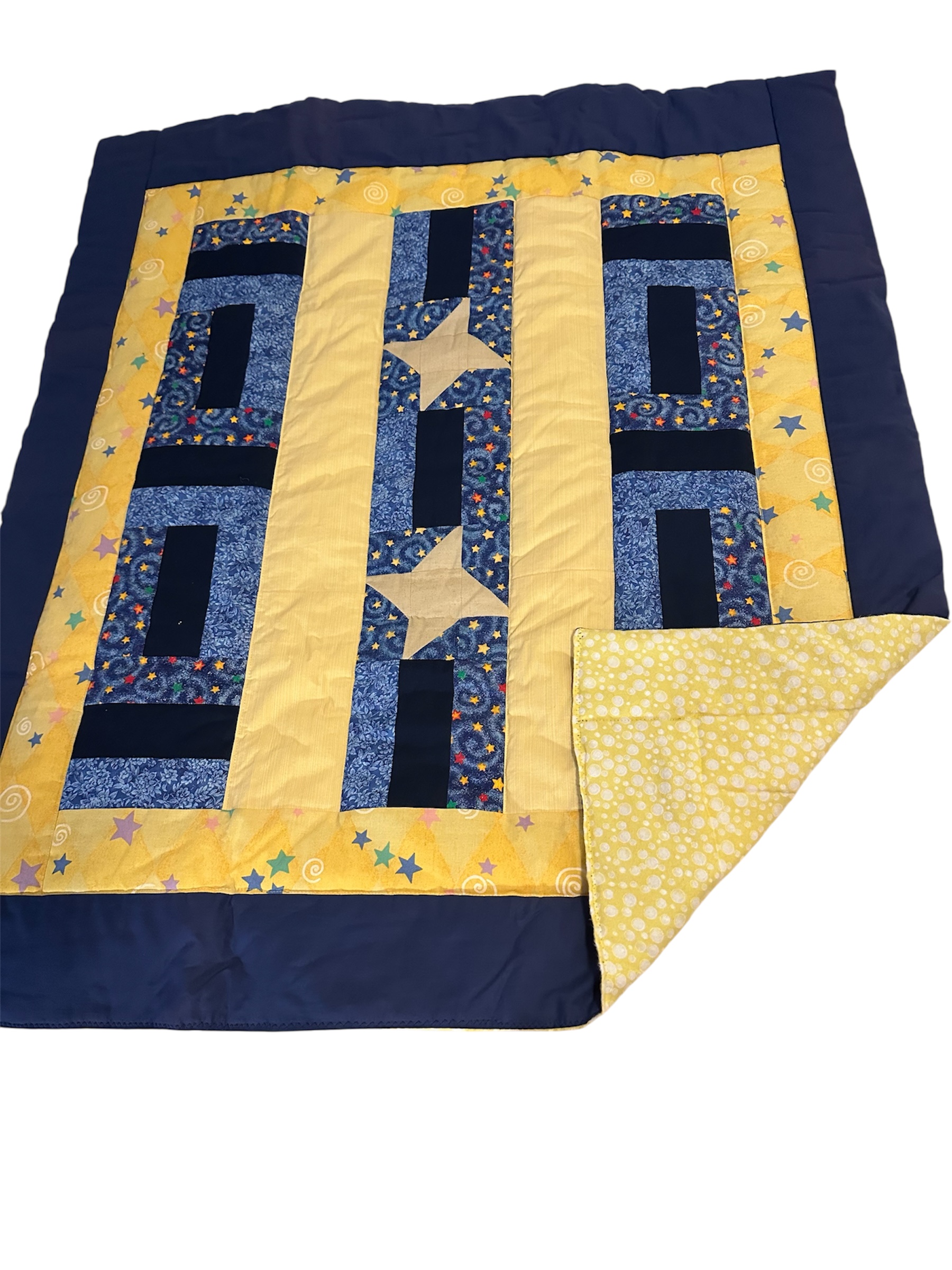 | Crib Quilt -Blue/yellow – Artisan‑made crib quilt featuring a bright blue and yellow star motif. The backing is a soft yellow printed flannel for added warmth and reduced slippage. Filled with plush fleece batting. Measures 41″L x 35½”W. Crafted by Sodi.”