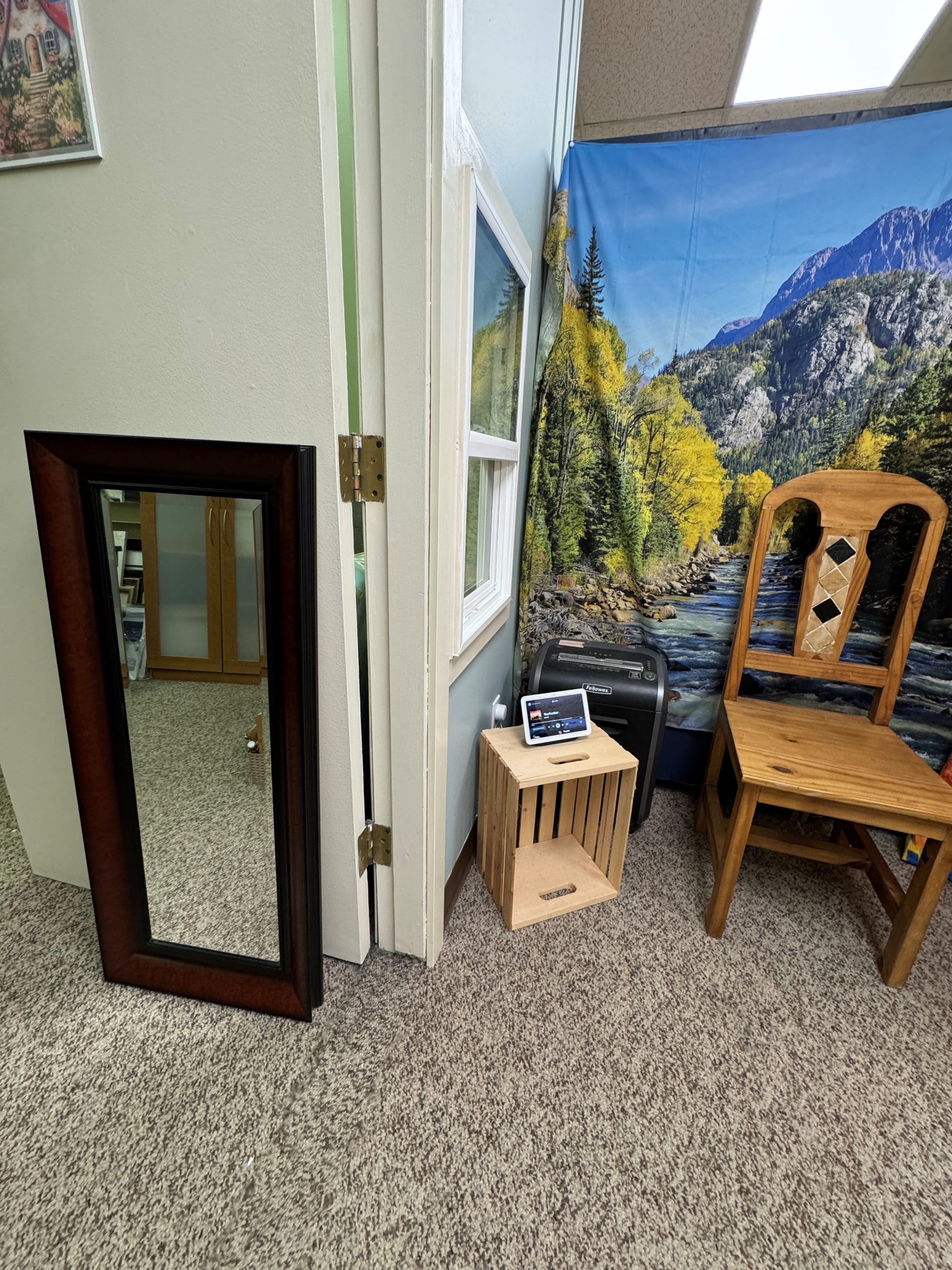 | Full Length Mirror – Full length solid wood framed beveled mirror. Can hang vertically or horizontally.