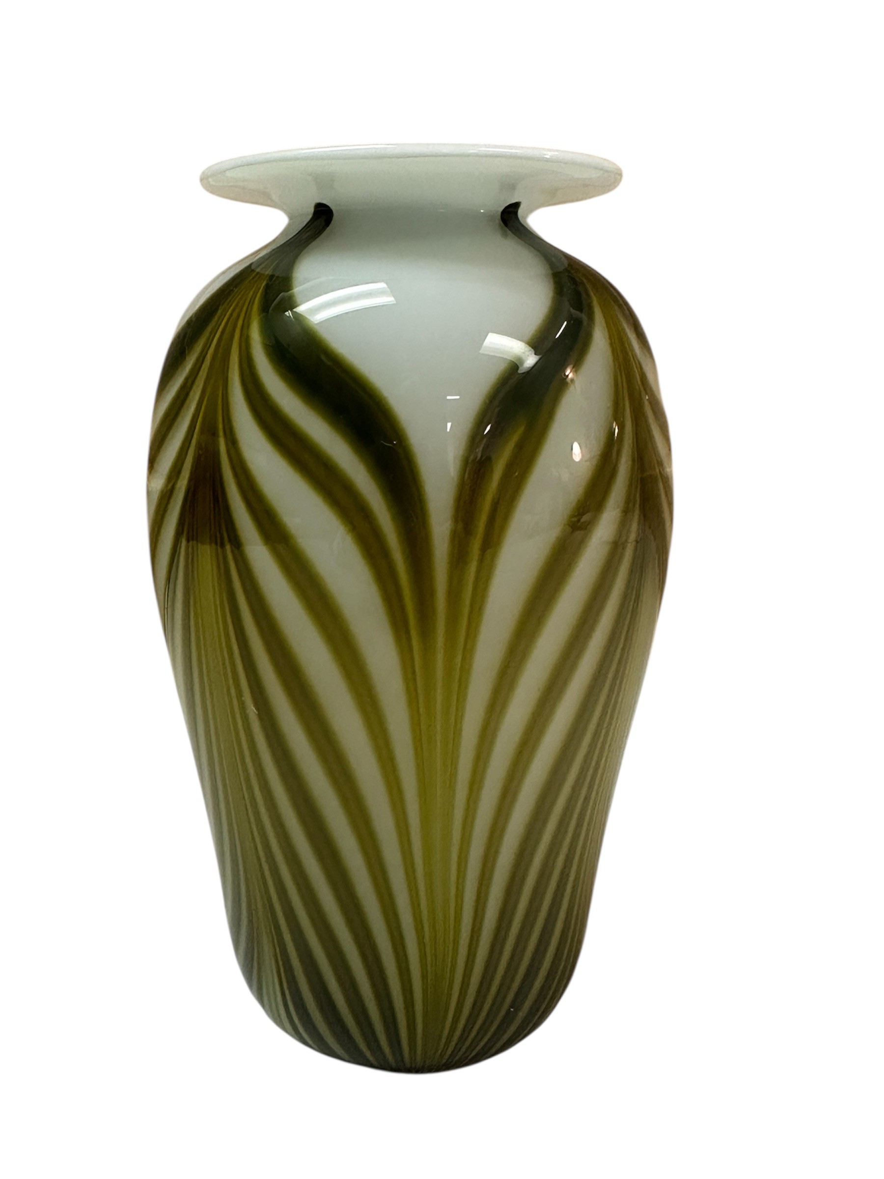 | Hand Blown Striped Vase – Hand‑blown glass vase featuring intricate craftsmanship, with moss‑green stripes flowing over a soft milky base.