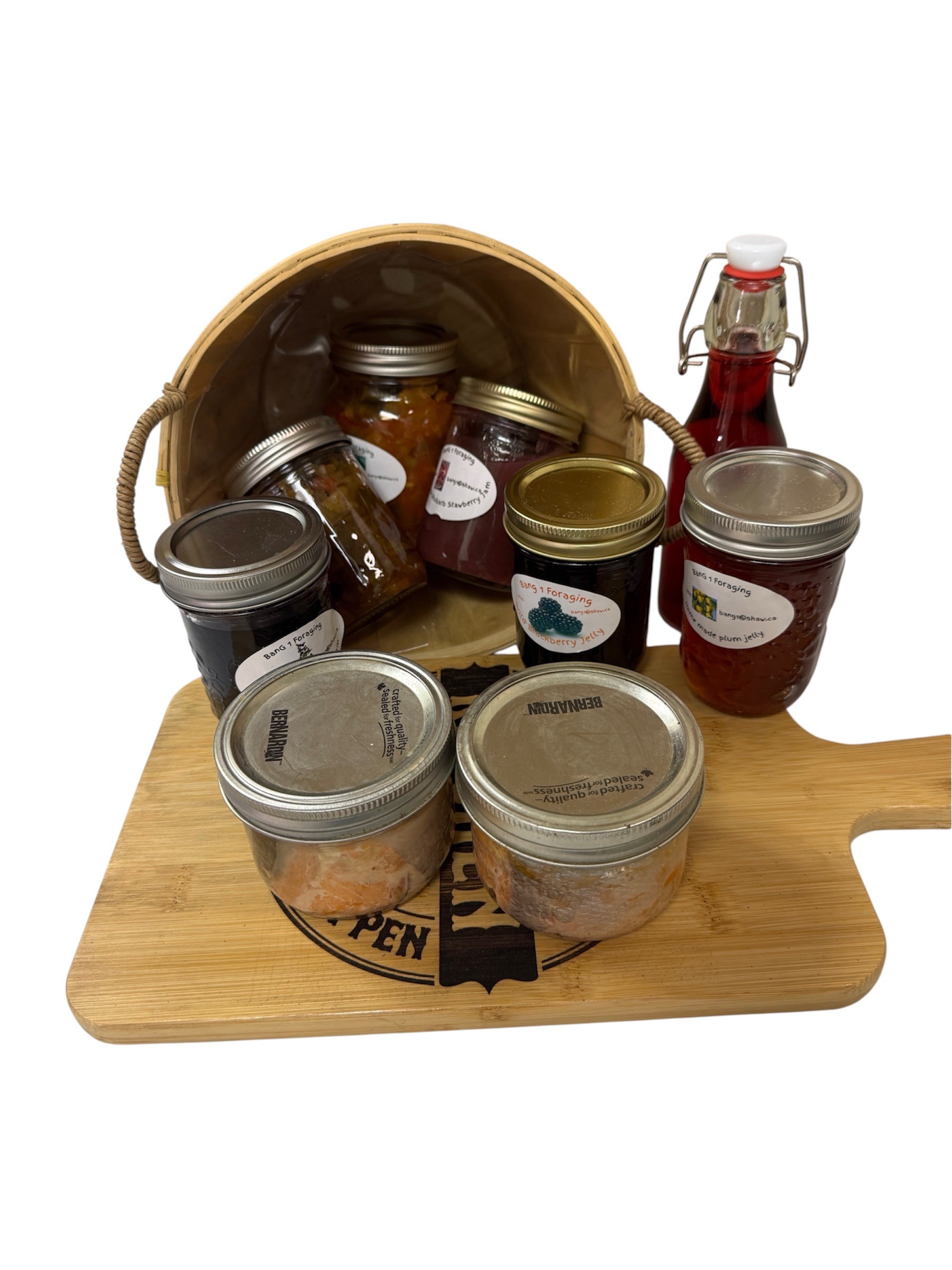 | Locally sourced and lovingly made, this basket includes 4 assorted jams, 2 jars of canned sockeye salmon, 1 jar of antipasta, 1 jars of relish, liqueur, and a lasered acacia cutting board