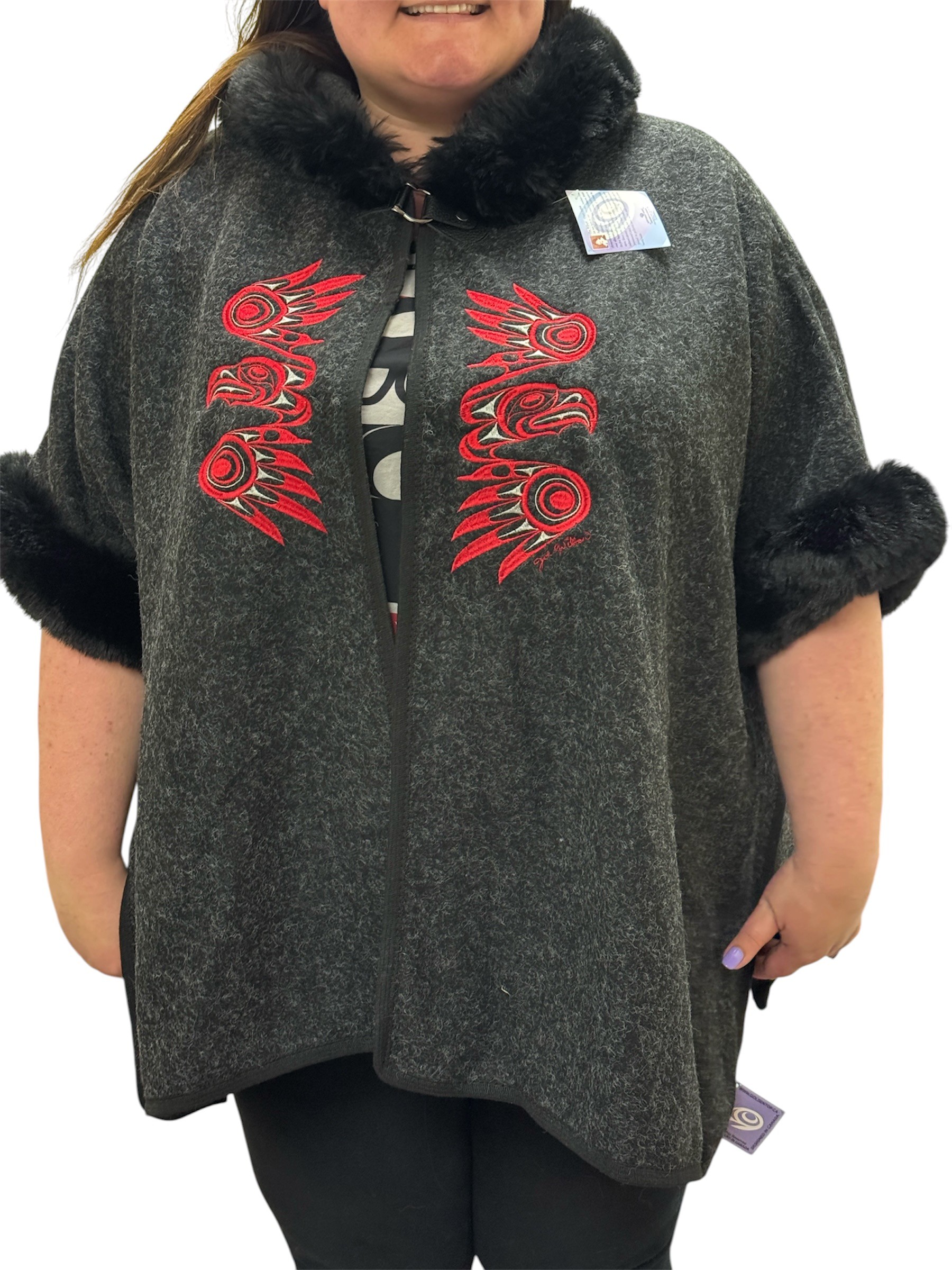 One-size Cape with design by Joe Wilson – Design by Joe Wilson, a prominent Coast Salish artist and carver. This one‑size‑fits‑all cape/shawl features bold red embroidery on soft grey fabric. Embroidered in Canada and distributed by Northwest Spirit.