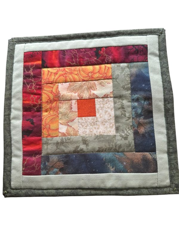 | Quilted Hotmat #1 – Beautifully quilted by “Sodie” in Log Cabin Pattern – Has Insulation -bright padding to resist heat 9″x9″