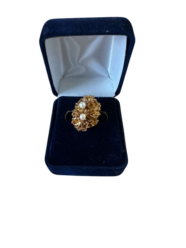 | Ring – Gold/Coral Reef/Pearl – Ring dipped 24 K gold, authentic pearls, coral reef, size 6/12-7, 1980s