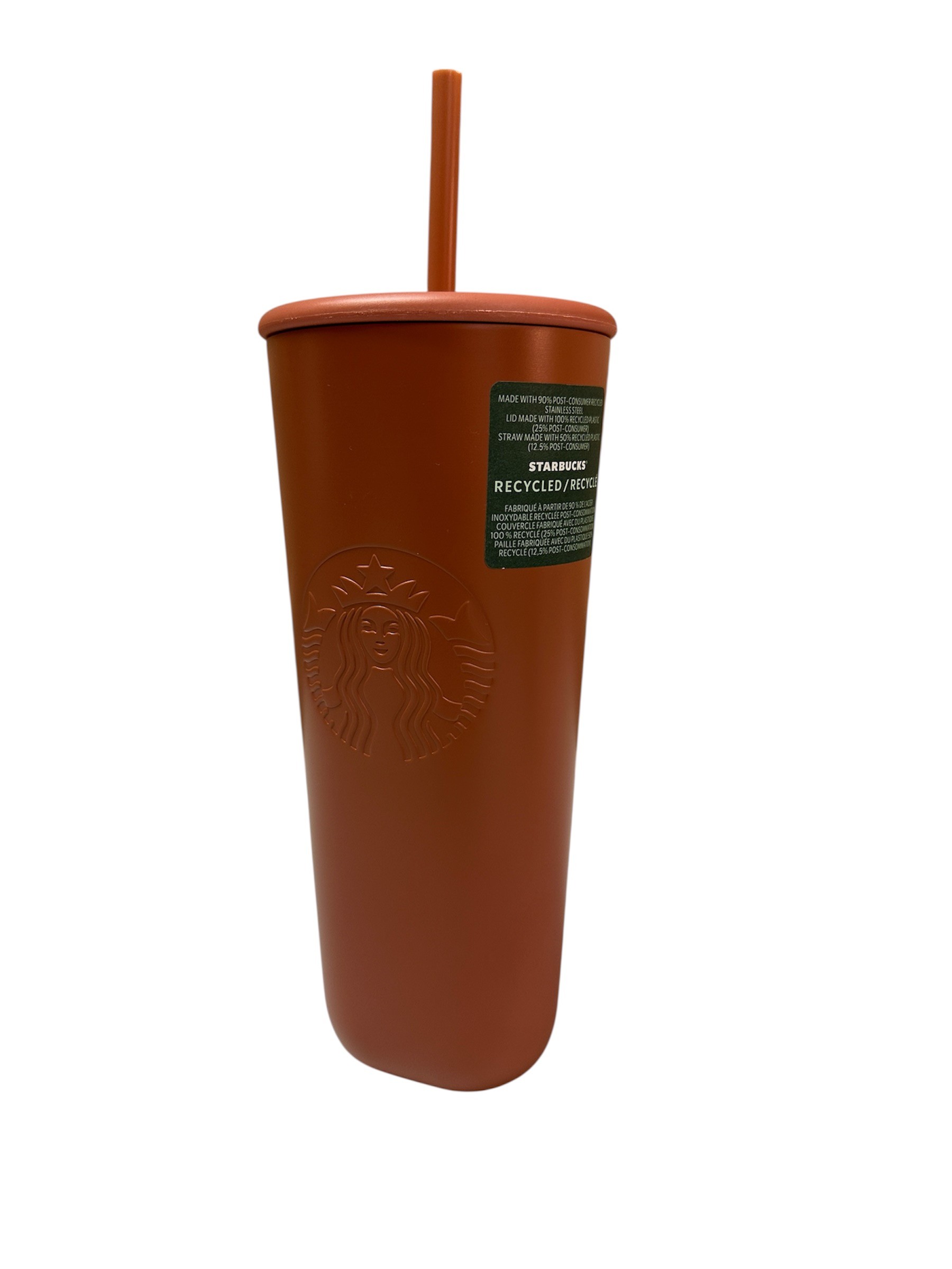 | Starbucks Recycled Tumbler & straw – 710 ml. – This Terra cotta large 710 ml. (24 oz.) tumbler for cold beverages is made with 90% post-consumer recycled stainless steel with a lid made from 100% recycled plastic.