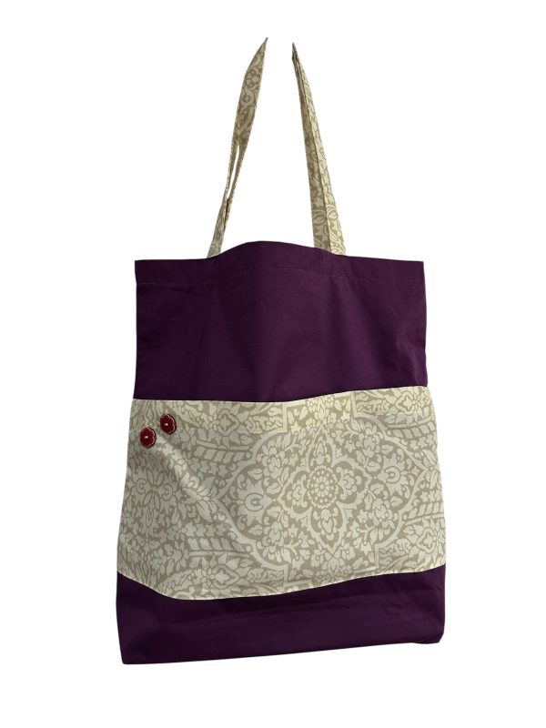 | Tote Bag – Purple – Crafted from a sturdy purple cotton décor fabric by “Sodie.” Features outer pockets. Measures 18″ x 17″